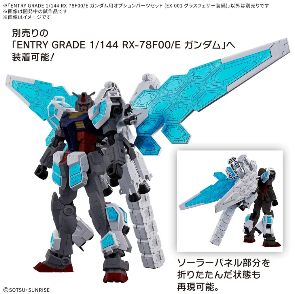 Yang membuatnya semakin menarik adalah hadirnya Glass Feather Equipment, fitur eksklusif yang tersedia dalam GunPla dan figur RX-78F00/E. Peralatan inovatif ini menghadirkan panel kaca biru berbentuk sayap, yang juga berfungsi sebagai booster untuk meningkatkan estetika serta mobilitas Gundam. Selain itu, Glass Feather Equipment dapat digunakan pada Entry Grade 1/144 RX-78F00/E Gundam yang dijual secara terpisah, memberikan lebih banyak opsi kustomisasi bagi para kolektor dan penggemar GunPla.